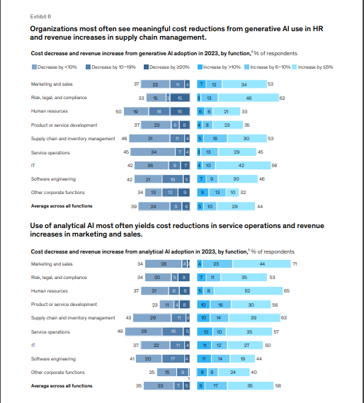 These findings underscore the strategic importance of AI in Marketing and Sales, not only as a tool for operational cost-cutting but also as a driver of top-line growth. For organizations looking to remain competitive, investing in AI capabilities in these functions can unlock both immediate gains and long-term potential as the technology matures.