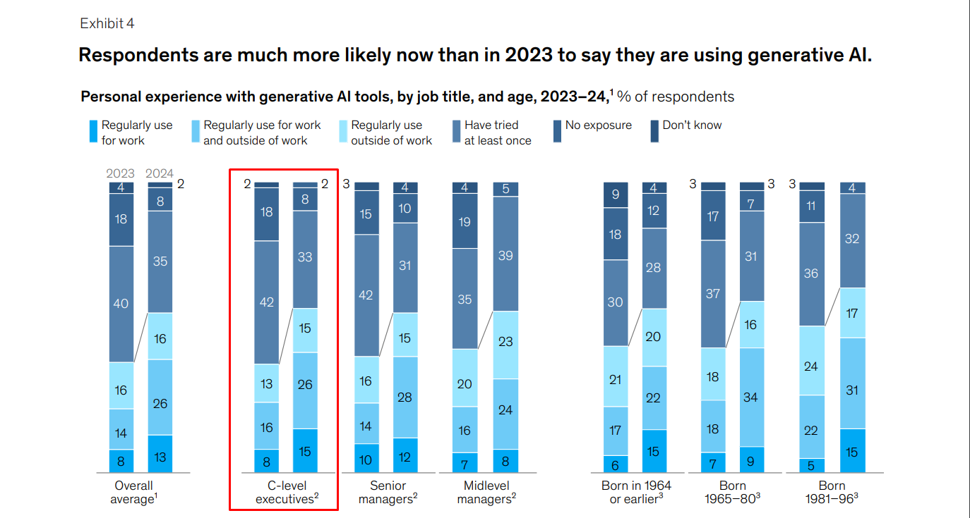 C-level executives demonstrate the highest adoption of generative AI tools, with 41% using them regularly for work, which is above the overall average. This group also has a notably low percentage (only 8%) with no exposure to generative AI, highlighting their proactive approach to embracing new technology. The increase in AI usage from 2023 to 2024 among C-level executives suggests they view generative AI as a strategic asset, essential for maintaining a competitive edge and driving innovation within their organizations.