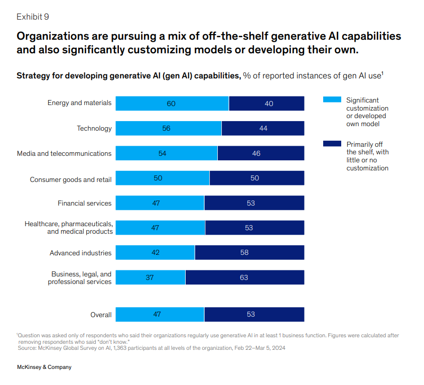 Mr. Alexander Sukharevsky, Senior Partner and Global Co-leader of QuantumBlack, said, “Although it varies by industry, roughly half of our survey respondents say they are using readily available, off-the-shelf generative AI models rather than custom-designed solutions. This is a very natural tendency in the early days of a new technology—but it’s not a sound approach as generative AI becomes more widely adopted.”